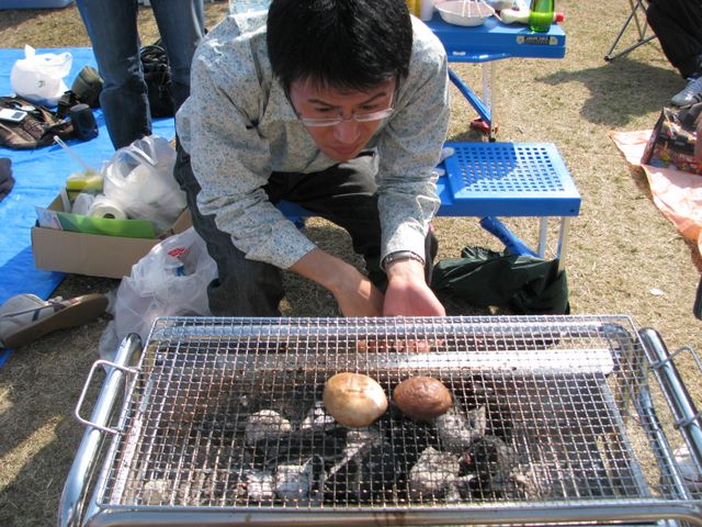お花見 -- キノコときのこ。 シュールな一枚。